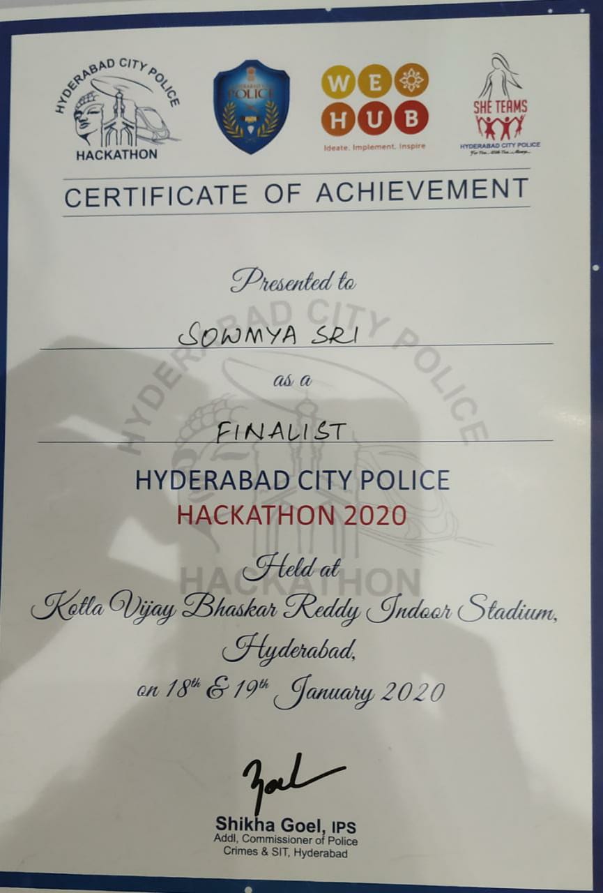 The Students from ECE II yr got selected in Finals of Hyderabad City Police Hackathon 2020.