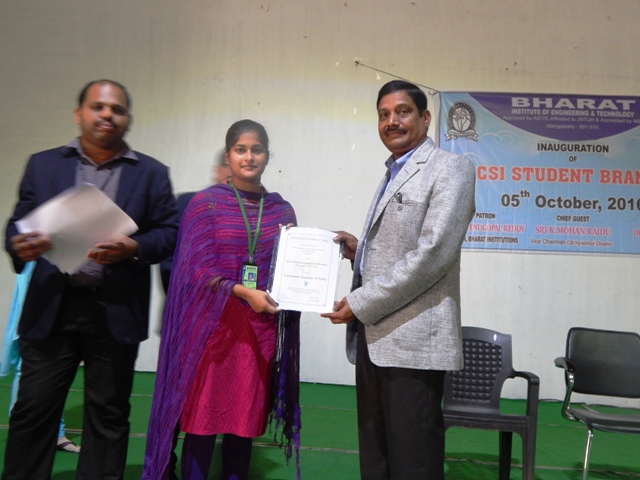 BIET has inaugurated \"BIET CSI Student Branch\" Hyderabad on 5th October 2016 under the able guidance of Shri CH. Venugopal Reddy, Chairman, Bharat Institutions. The Inaugration was done at the kind hands Shri. K. Mohan Raidu, Vice-Chairman, CSI Hyderabad Chapter. The CSE/IT Department organized the event and student members from both the departments actively volunteered to form the student branch committee.