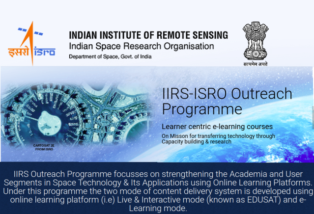 Objective of this outreach program is to provide an opportunity for individuals to learn Remote Sensing and Geoinformation Science for the benefit of their professional career. Courses in Remote Sensing and Geoinformation Science will allow graduates to build their knowledge and practical expertise in RS and GIS technologies with independent study and project experience at the certificate level. IIRS ISRO E-learning platform offers different courses such as Basics of Geocomputation and Geoweb services, RS & GIS Applications, Geographical Information systems, Understanding of Coastal Ocean processes using RS & Numerical Modelling, Global navigation satellite systems, RS & Digital image analysis, RS Applications in agricultural water management and many more.