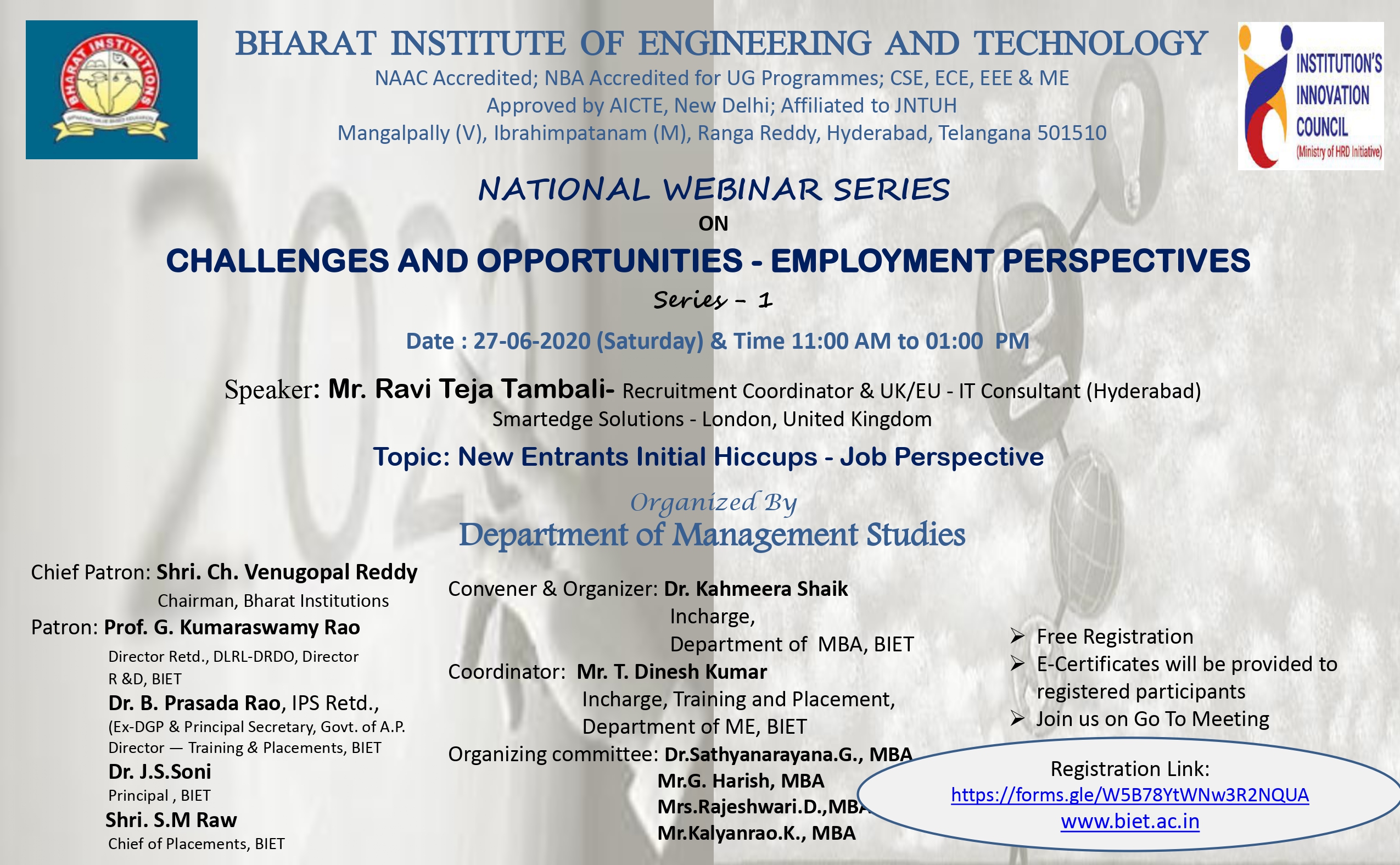 MBA Department has organised National Webinar Series on “CHALLENGES AND OPPORTUNITIES - EMPLOYMENT PERSPECTIVES” on 27-06-2020