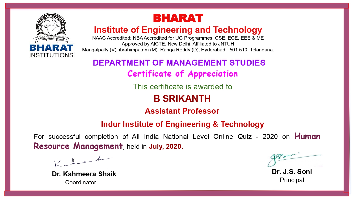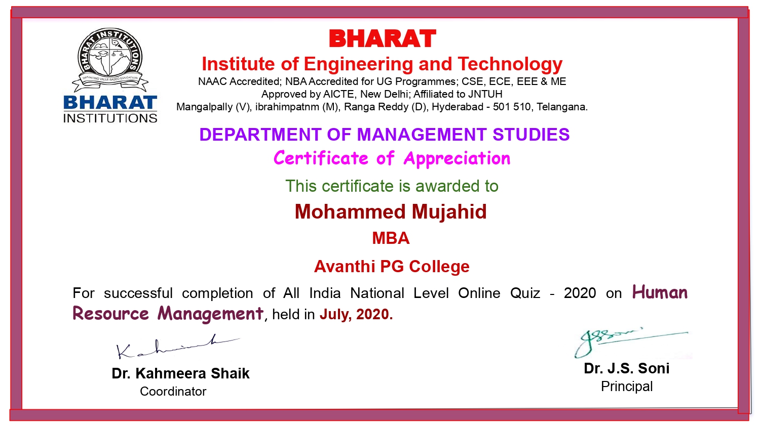 MBA Department has conducted All India National Level Online Quiz - 2020 on Human Resource Management held in July, 2020 .