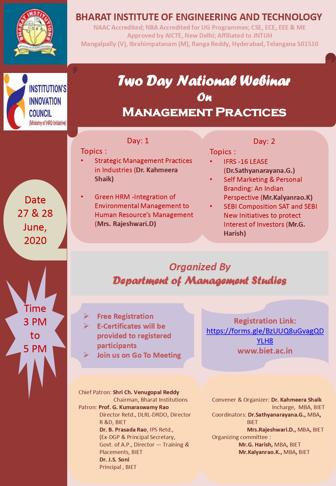 MBA Department has organised Two Day National Webinar on “Management Practices ” on 27-06-2020 and 28-06-2020