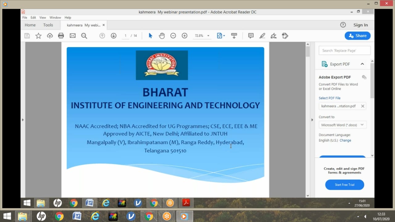 MBA Department has organised National Webinar Series on “CHALLENGES AND OPPORTUNITIES - EMPLOYMENT PERSPECTIVES” on 27-06-2020 .