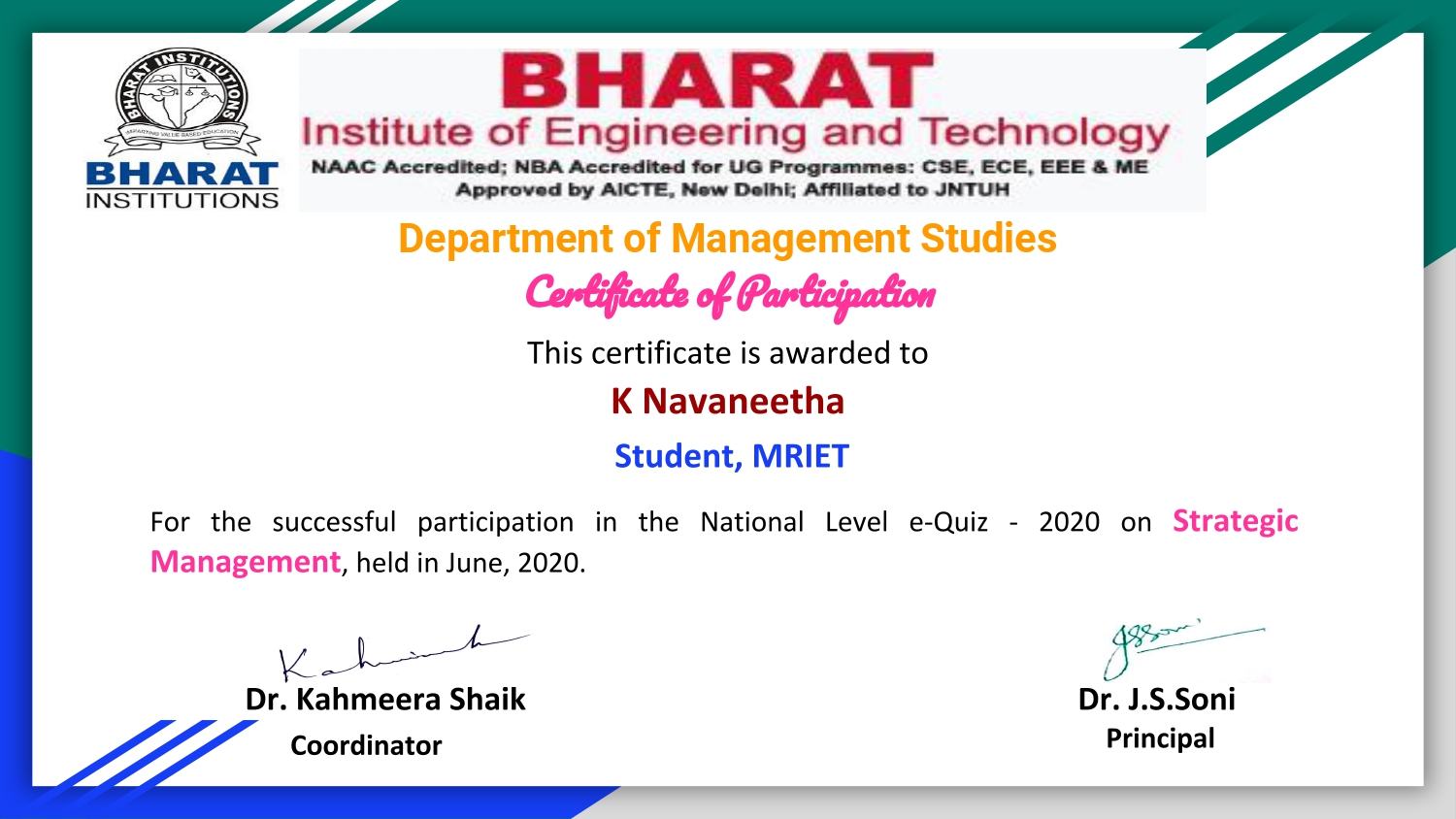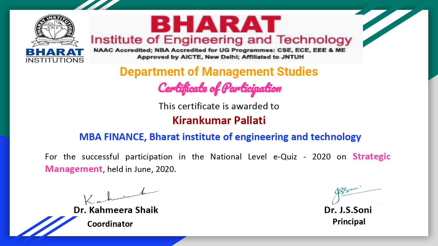 MBA Department has conducted National Level e Quiz - 2020 on Strategic Management held in June, 2020