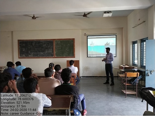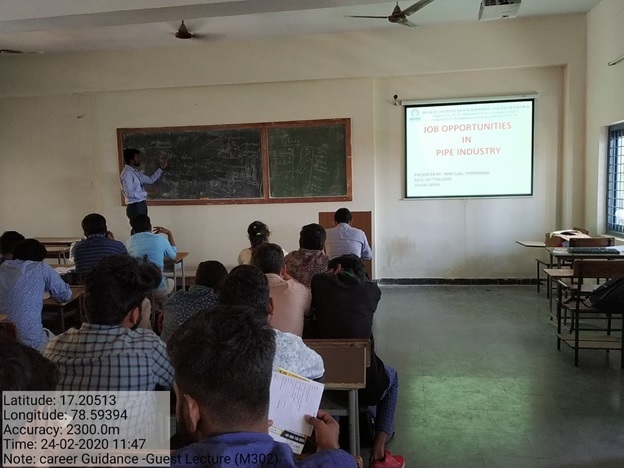 Department of Mechanical Engineering has organised a GUEST LECTURE on “JOB OPPORTUNITIES IN PIPE INDUSTRY” for the 3rd year Mechanical Students on 24.02.2020 at 01:00 PM by “SMEC LABS - HYD”.