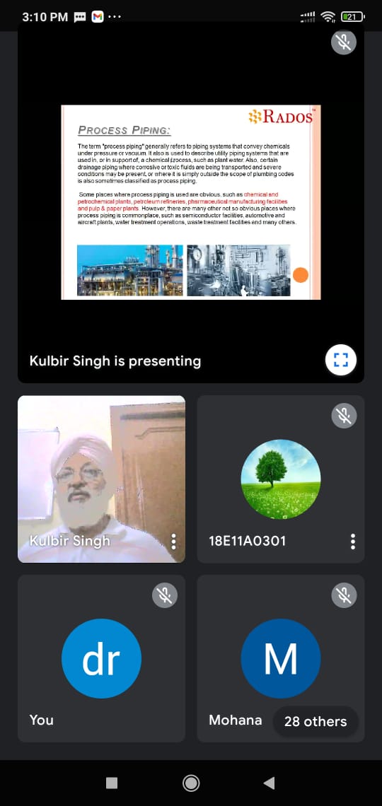 In Collaboration with RADOS ENGINEERING, Mohali, Punjab,Department of Mechanical Engineering Conducted EXPERT Lecture on IMPORTANCE OF PIPING IN INDUSTRY on 18th June 2021