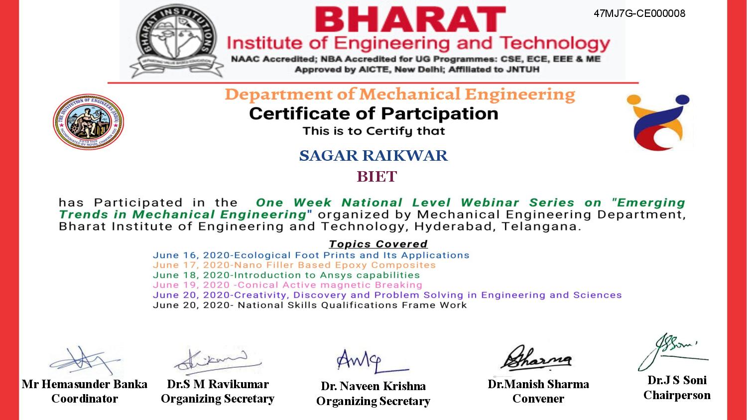 Department of Mechanical engineering organized an National Level online quiz on Introduction to Mechatronics was conducted on 23rd June,2020 by Dr.S M RAVI KUMAR. at Bharat Institite of Engineering and Technology, Hyderabad, Telangana E-Certificates were issued to the participants
