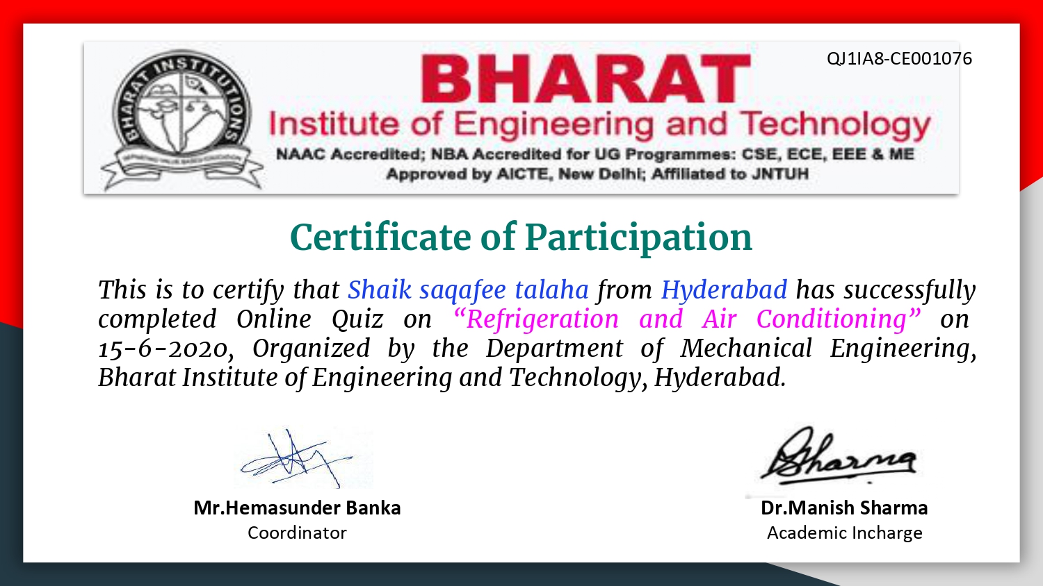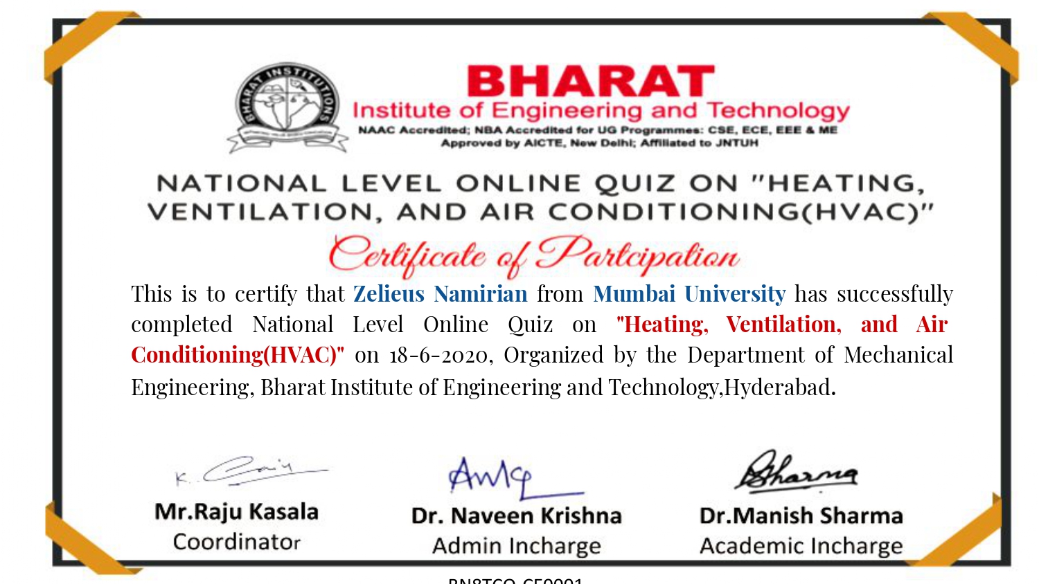 Department of Mechanical engineering organized an Natinal Level online quiz on Heating, Ventilation and Air conditioning on 18th June,2020 at Bharat Institite of Engineering and Technology, Hyderabad, Telangana. E-Certificates were issued to the participants