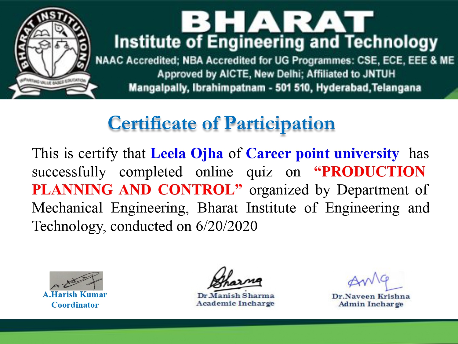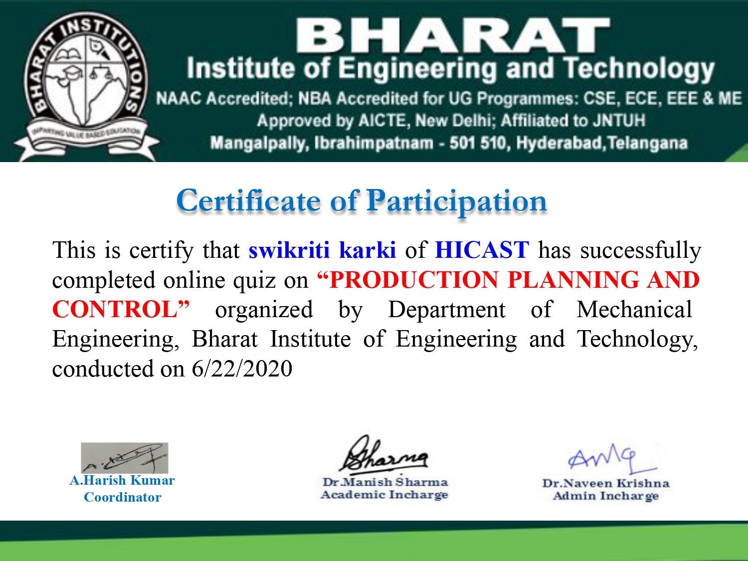 Department of Mechanical engineering organized an Natinal Level online quiz on Production, Planning and Control on 20th June,2020 at Bharat Institite of Engineering and Technology, Hyderabad, Telangana