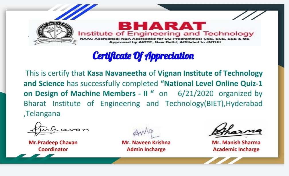 Department of Mechanical engineering organized an Natinal Level online quiz on skill development and testing in Design of Machine members - II on 19th June,2020 at Bharat Institite of Engineering and Technology, Hyderabad, Telangana