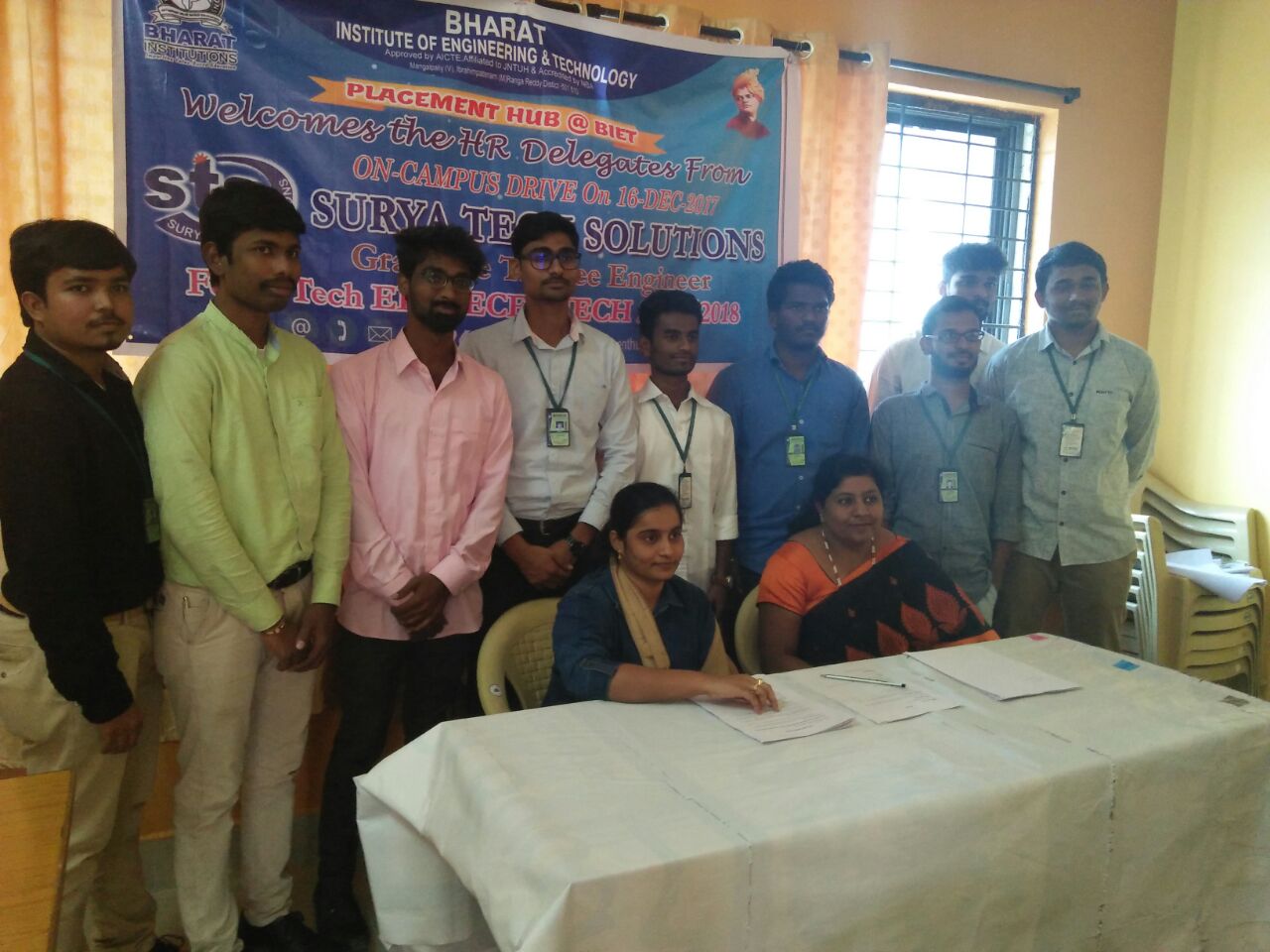 Surya Tech Solutions conducted ON CAMPUS Drive for B.Tech EEE/Mech. on 16 Dec 2017 with 17 selects .8 from B.Tech EEE and 7 from B.Tech Mech .2 from B.tech ECE ex Bharat Students.