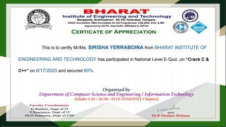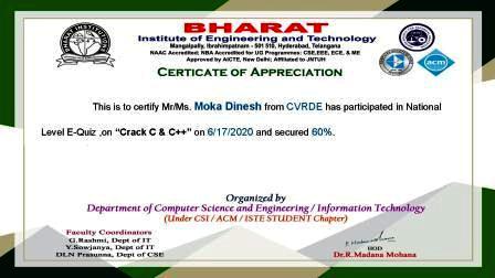 Department of IT and CSE are organised a National Level E-Quiz on "Crack C& C++" from 17/06/2020 to 20/06/2020 under ACM/CSI/ISTE Student Chapter.
