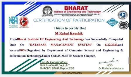Department of CSE&IT has organised a National Level E-Quiz on "Database Management Systems" on 22/06/2020 under ISTE,ACM&CSI chapters.