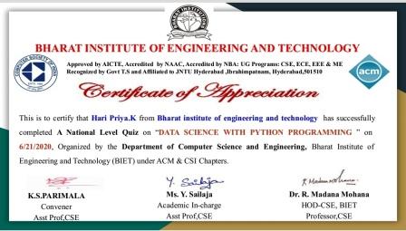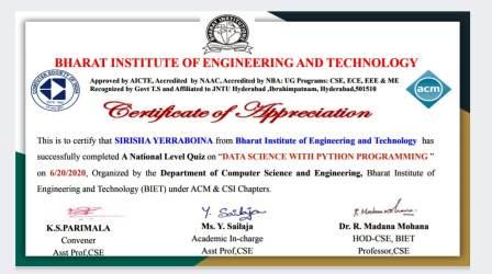 Department of CSE&IT has organised a National Level E-Quiz on "Data Science with Python Programming" on 20/06/2020 under ACM&CSI chapters.