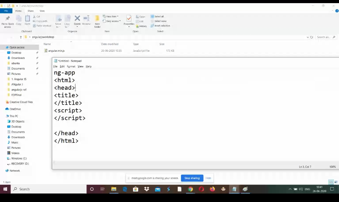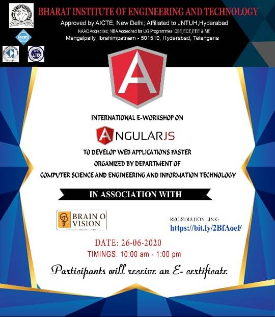 International E-Workshop on "Angular JS" on 26/06/2020, organized by department of Computer Science and Engineering & Information Technology in association with Brain O Vision.