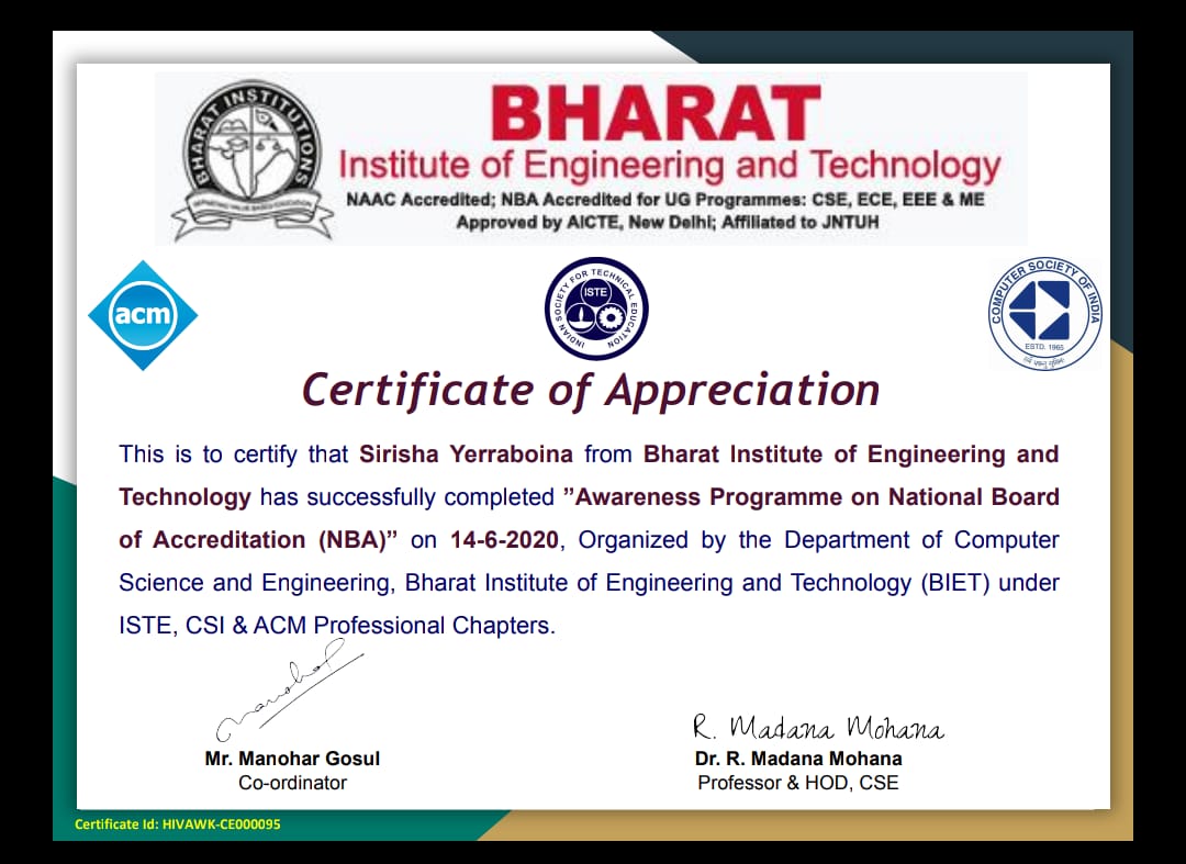 The Department of Computer Science and Engineering has organized E-Quiz on "Awareness Programme on National Board of Accreditation" on 14-June-2020, under ISTE, CSI & ACM Professional Chapters.