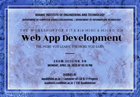 Department of CSE organised a e-Work shop on "Web App Development" by Dr. Mohammed Aquil Mirza, Associate Professor of CSE Dept on 20-Apr-2020