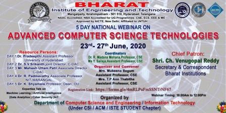 5-Day National level Webinar on "Advanced computer science and technologies" from 23rd june to 27th june 2020