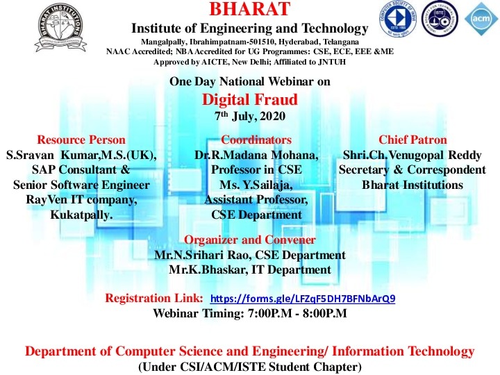One day National Level Webinar on “DIGITAL FRAUD” on 7-7-2020 by S.Shravan Kumar organized by the Department of CSE/IT under ACM/CSI/ISTE chapters