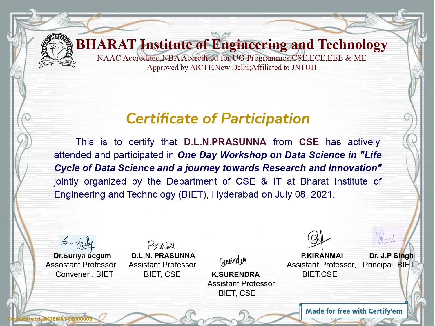 Department of Computer Science & Engineering and Information Technology organized online Workshop on DATA SCIENCE on 08-07-2021.Speaker: Mr.Farooq Ahmed Siddiqui.K,Innovision Solutions Pvt.Ltd