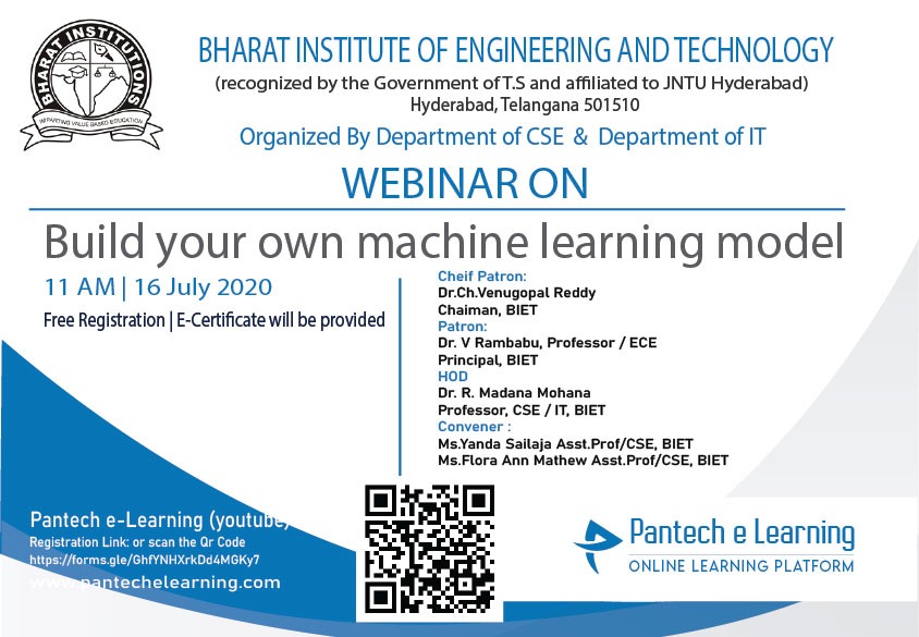 Webinar on "Building your own Machine learning model" on 16-7-20 in association with Pantech e-learning organized by the Department of CSE/IT under CSI,ACM and ISTE chapters.