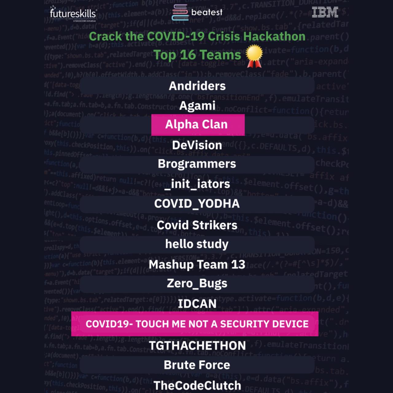 It was overwhelming and brings a great pleasure to witness that 2 of our teams (one from CSE and other from ECE) were shortlisted for the finale where students from more than 500 Institutions across India from 26 States with 26,478 registrations participated in the Hackathon which was organized by NASSCOM-IBM Crack the COVID 19 crisis in Jun 2020