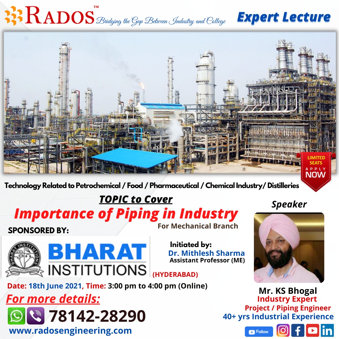 In Collaboration with RADOS ENGINEERING, Mohali, Punjab,Department of Mechanical Engineering Conducted EXPERT Lecture on IMPORTANCE OF PIPING IN INDUSTRY on 18th June 2021,Speaker: Er. K.S. Bhogal, Project / Piping Engineer (40+ years’ Experience)