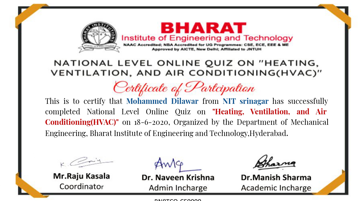 Department of Mechanical engineering organized an Natinal Level online quiz on Heating, Ventilation and Air conditioning on 18th June,2020 at Bharat Institite of Engineering and Technology, Hyderabad, Telangana. E-Certificates were issued to the participants