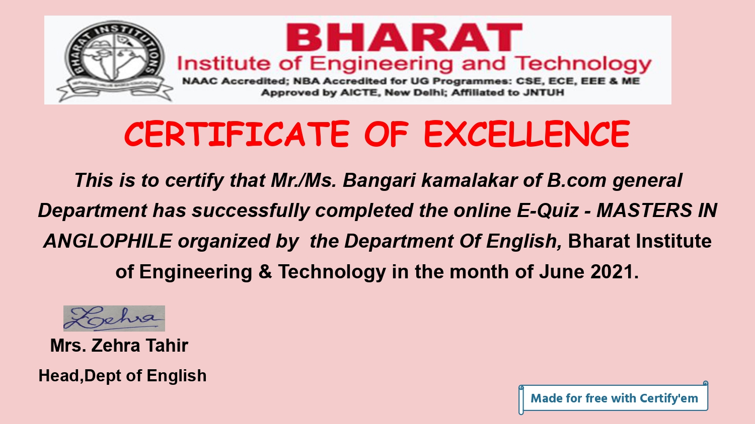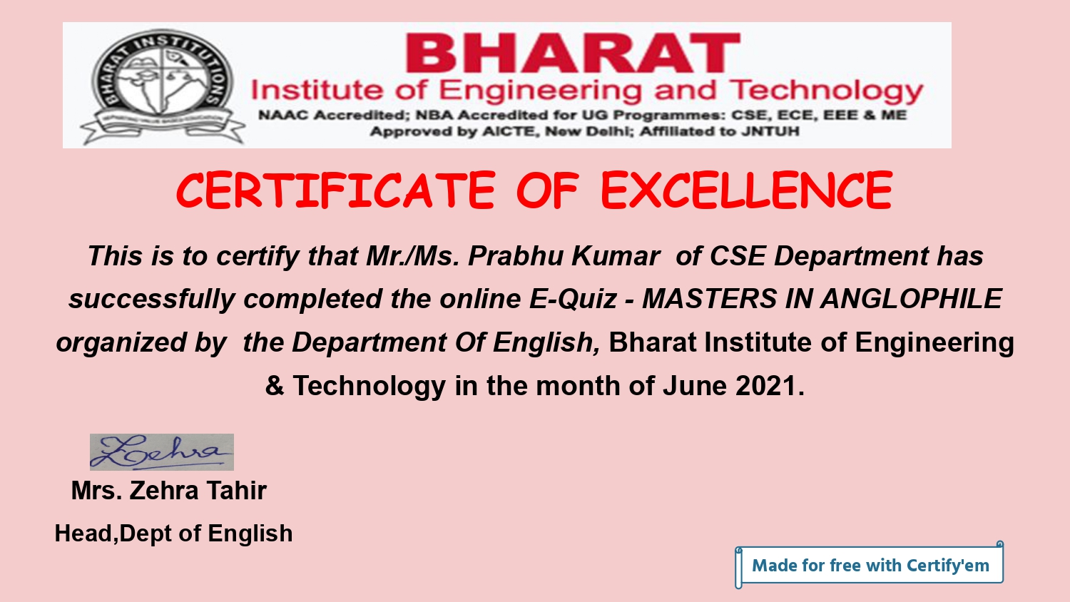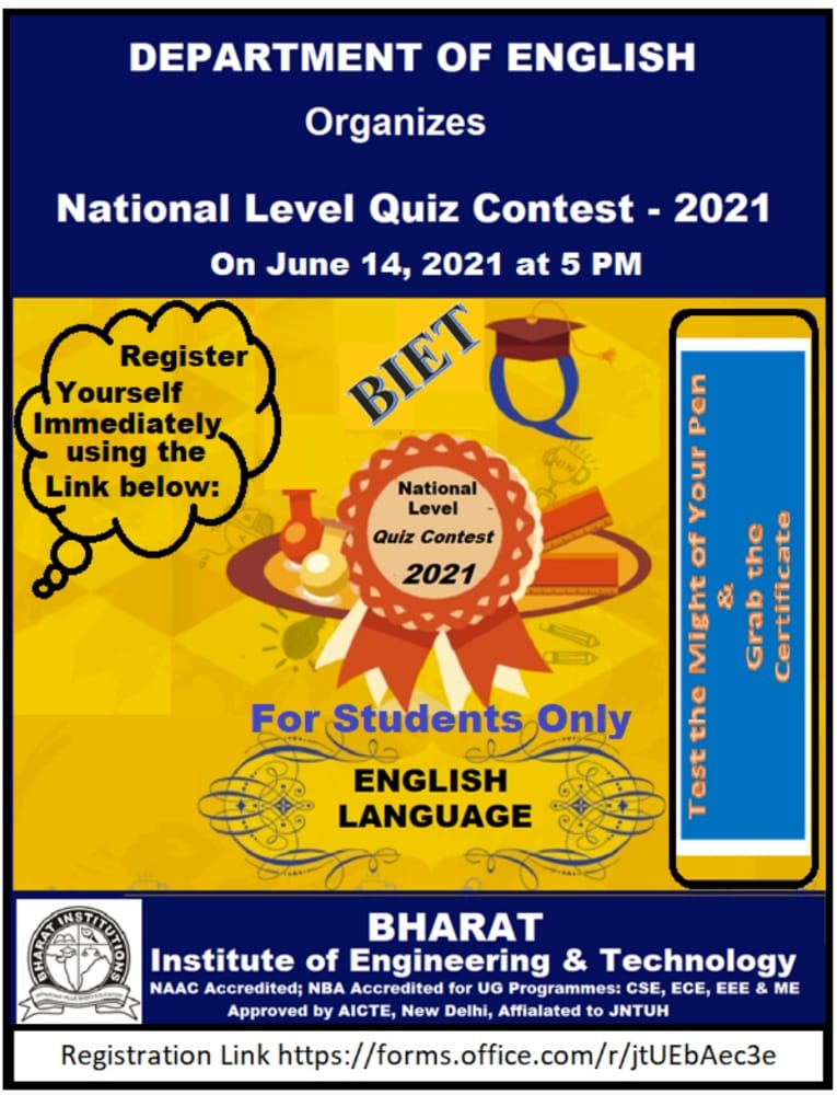 Department of S&H (Mathematics), Bharat Institute of Engineering and Technology organized the National Level Online Quiz on "Basic Mathematics "on 14th June 2021.