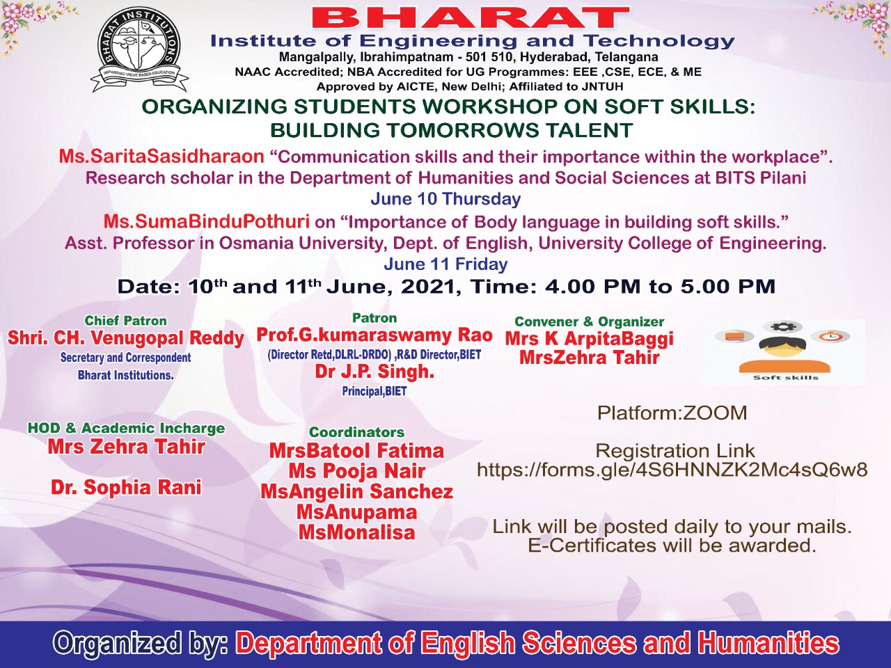 Department of English organized online Student Workshop on Soft Skills : Building tomorrows Talent on 10th and 11th June 2021